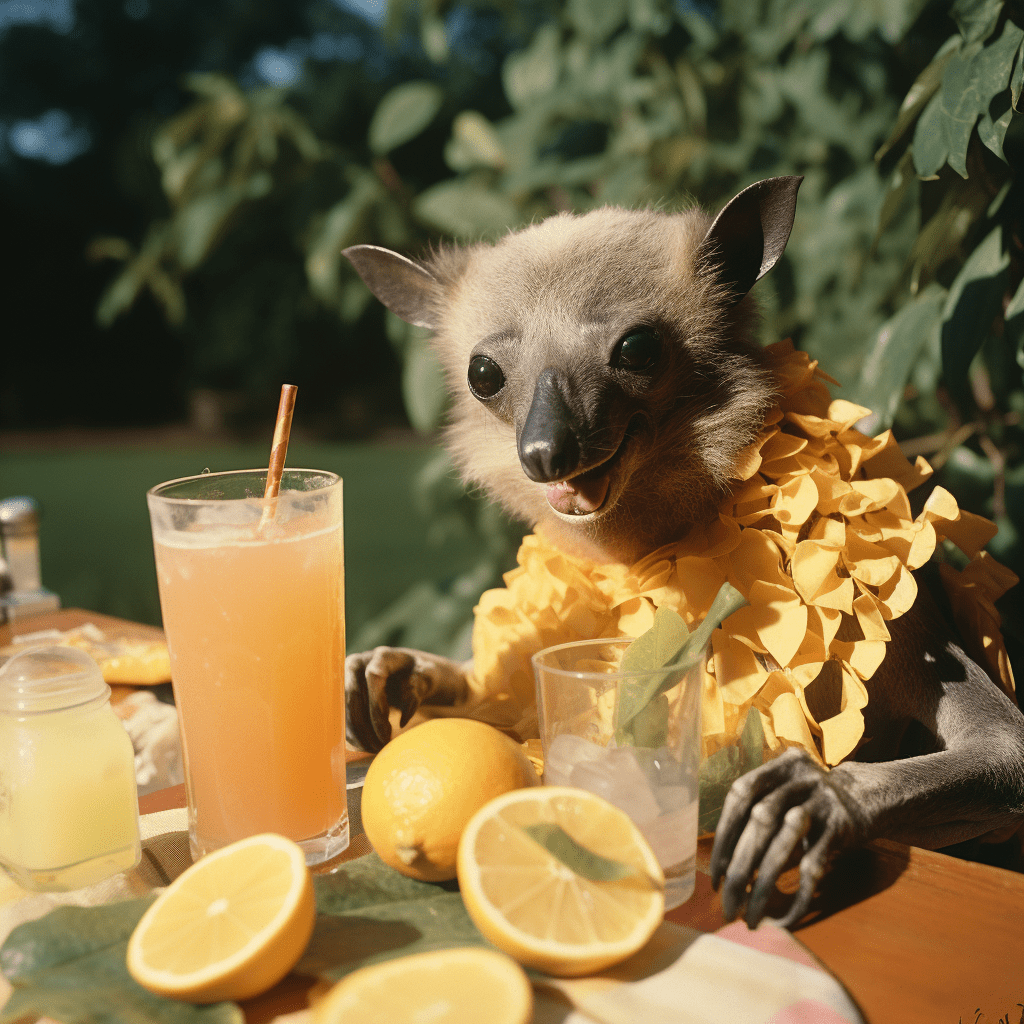 Midjourney prompt: Kodachrome image of anthropomorphic fruit bat enjoying a mimosa in Florida in 1962