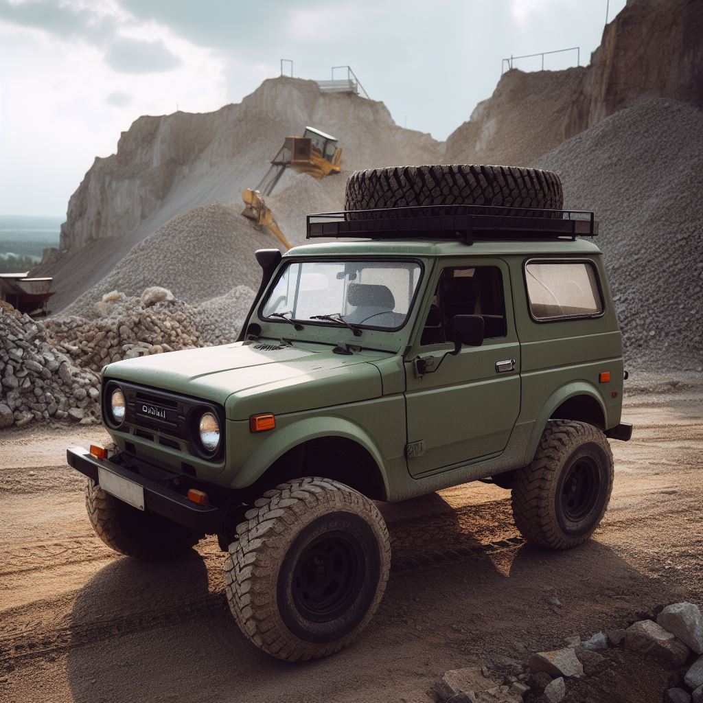 Bing prompt : green, 1984 suzuki jimny sj20, with a spare tire on the roof, rock quarry byBing prompt: green, 1984 suzuki jimny sj20, with a spare tire on the roof. Autobot logo in the center of the roof. jungle.