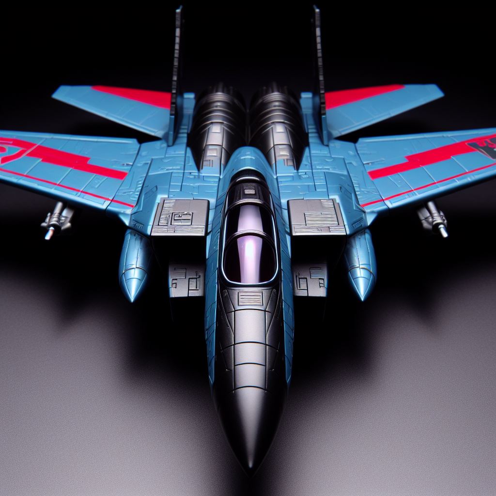 Prompt for Bing and Midjourney: f-15 Eagle, black nose cone, black stabilizer fins, blue body in the style of g1 thundercracker. red stripes on front of wings. Decepticon logo in middle of wings.