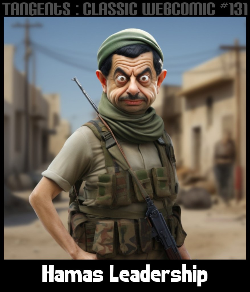 Mr. Bean is a beloved fictional character created and portrayed by British actor and comedian, Rowan Atkinson. He is known for his childlike mannerisms, peculiar behavior, and his overall clumsiness. Mr. Bean is a socially awkward and often silent character who navigates through various humorous situations in his daily life. He rarely speaks, relying mostly on physical comedy and facial expressions to convey his thoughts and emotions. With his signature teddy bear and an old green Mini, Mr. Bean finds himself in amusing misadventures, often causing unintentional chaos and confusion. The joke in this image involves portraying the leader of Hamas as Mr. Bean, juxtaposing the serious political figure with the lighthearted and comical nature of the fictional character. It uses humor to satirize and make light of the situation, providing a satirical commentary.