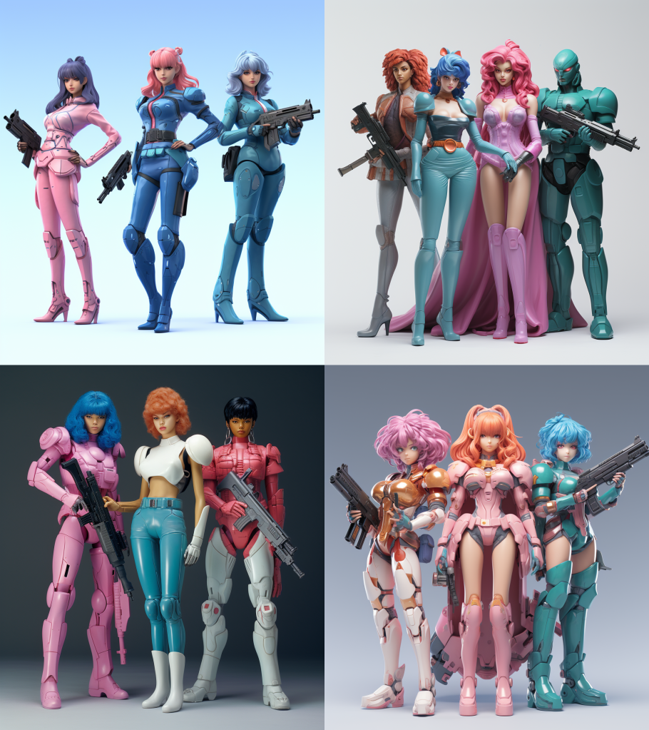 4️⃣ four cartoon characters standing together each with a gun, in the style of mecha anime, dark turquoise and light pink, naoko takeuchi, smooth curves, casts of spaces, photo taken with provia, bold colors, strong lines –ar 8:9
