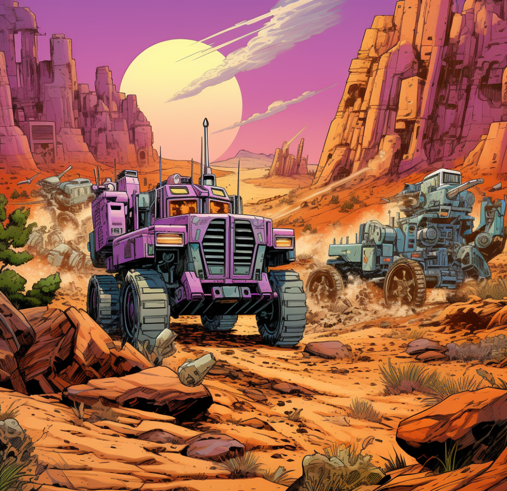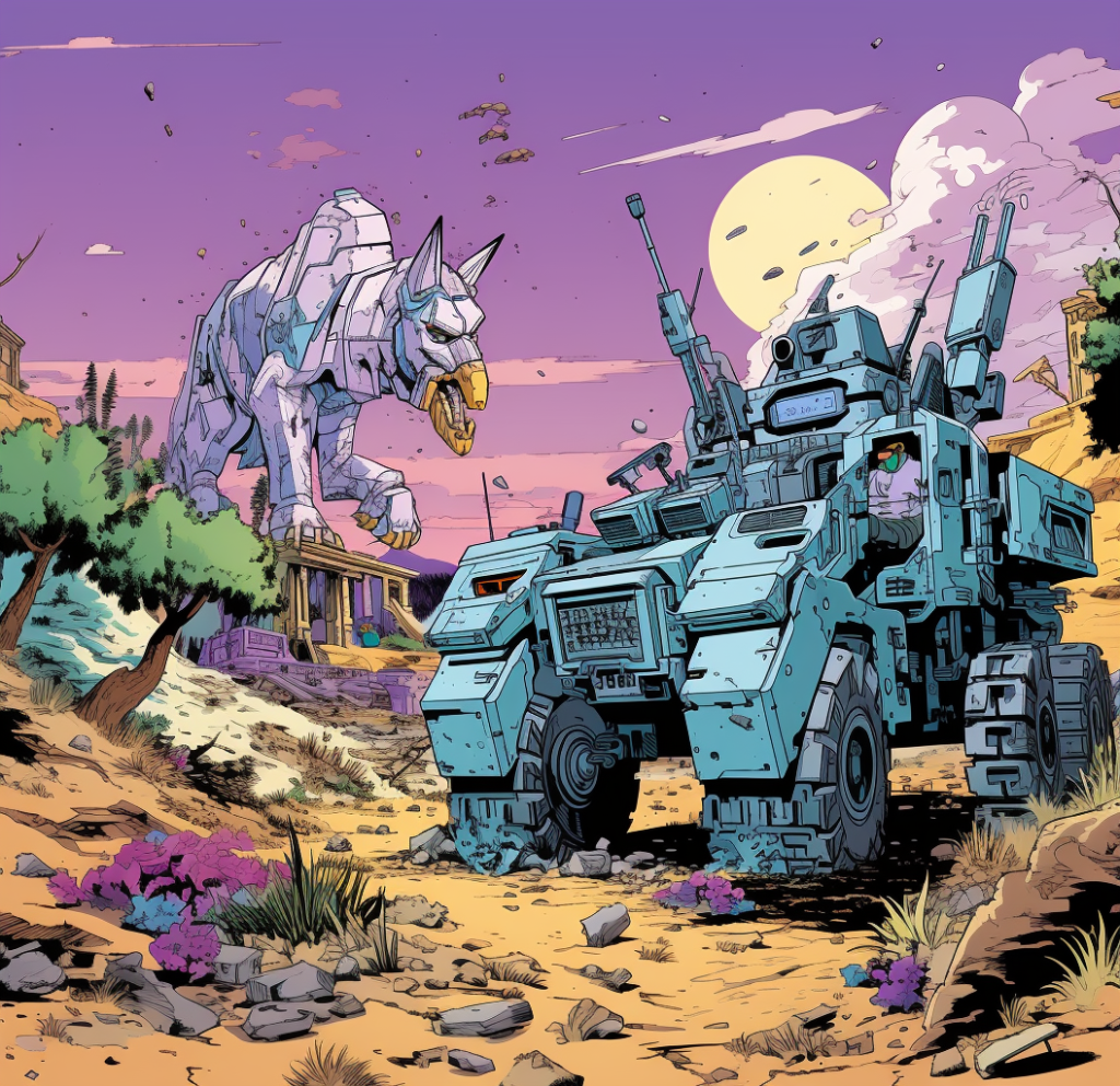 4️⃣ transformers, retaliation, and the hunter, in the style of comic strip imagery, light turquoise and violet, desertpunk, clever juxtapositions, post-’70s ego generation, blink-and-you-miss-it detail, gesture driven –ar 80:77