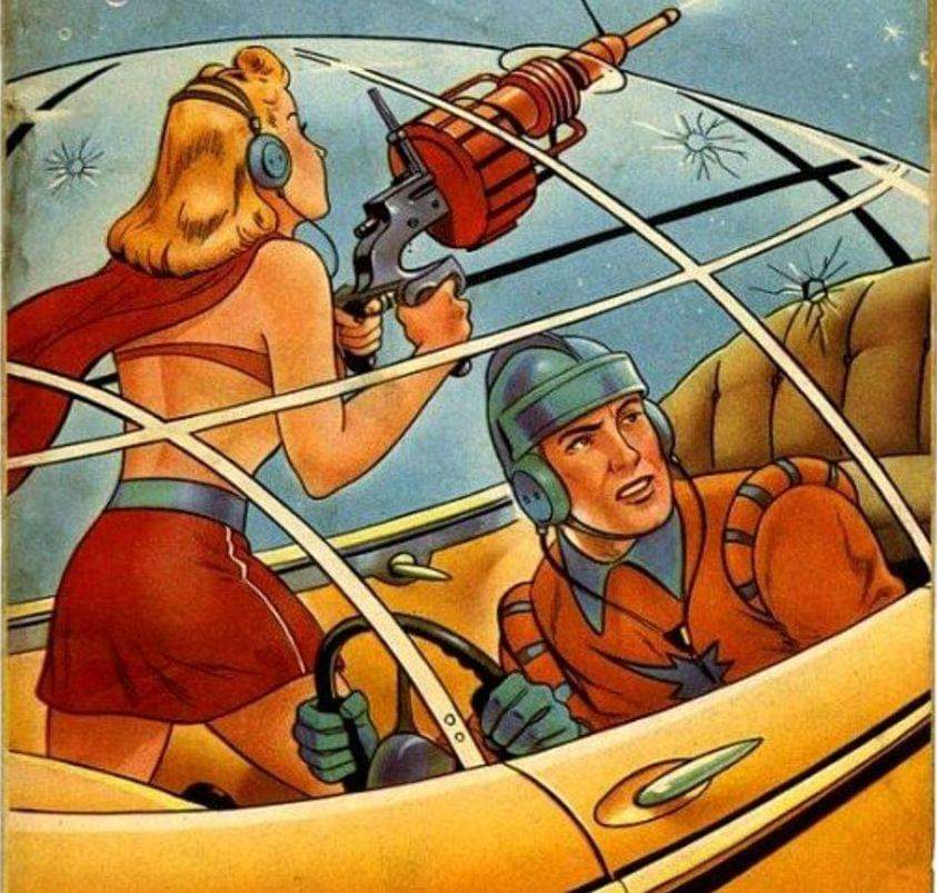 3️⃣ four old and crazy comics cover featuring a woman and a space bomber, in the style of trompe-l’œil illusionistic detail, adventure pulp, classic american cars, flickr, kodak vision3, action-packed cartoons, precise nautical detail –ar 21:20