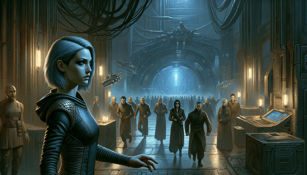 Chaos erupted as Zaridian guards rallied, their ferocious cries echoing through the void. Blaster fire streaked the darkness, a deadly dance of light and shadow. Nyx, her heart pounding with fear and determination, shielded the humans, her own body a barrier against her kin’s wrath.