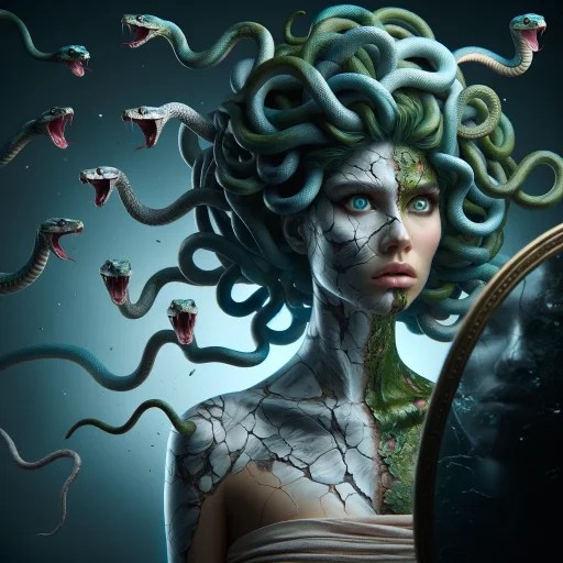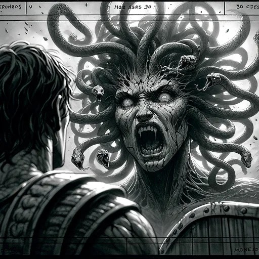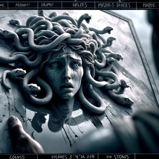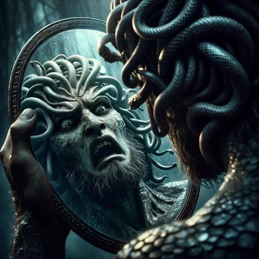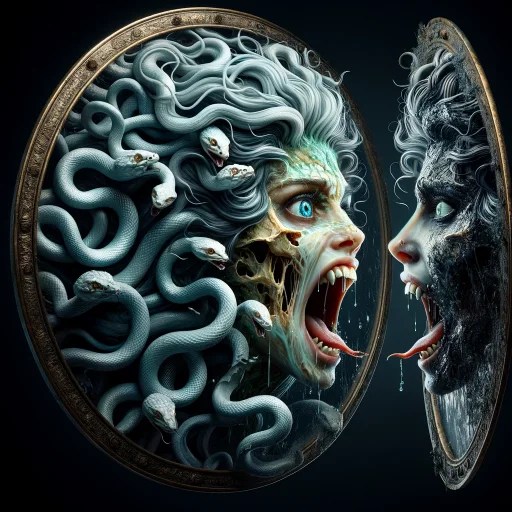 Chat GPT: Here is the image based on your request. It captures Medusa’s reflection in a shield, showing her expression of extreme fear and her partial transformation into a statue.