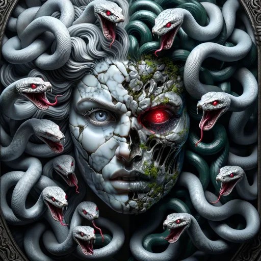 I like the layout of the image but I want some improvements. I want her facial expression and frozen in two different states of fear. One state of fear is where her face is completely transformed into marble and it shows fear, the other part of her face that is still alive shows an even wilder greater expression of fear with a single glowing red eyeball. Part of the snakes in her hair seem marbleized in contorted expressions. The other parts of her hair are wild and riving with glowing red eyes in the snakes in her hair.