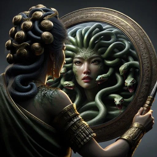 I want to test the limits of your image generation. I want an image of Medusa and the soldier that killed her. But I want the focus all on Medusa. I want the camera view behind Medusa over her shoulder looking down towards the shield so that we only see Medusa’s face through the reflection on the shield. Her reflection should show extreme fear and the parcel transformation into a statue