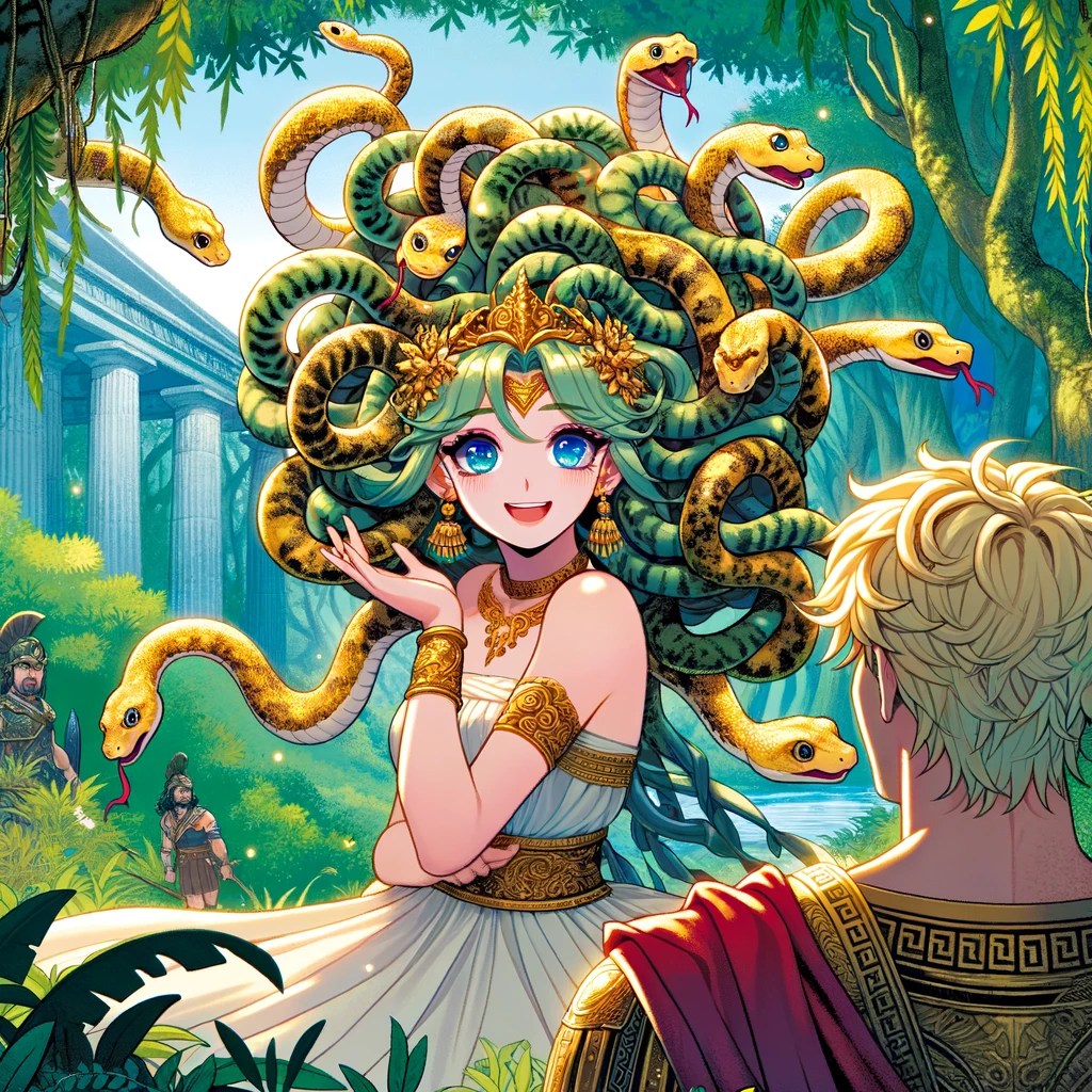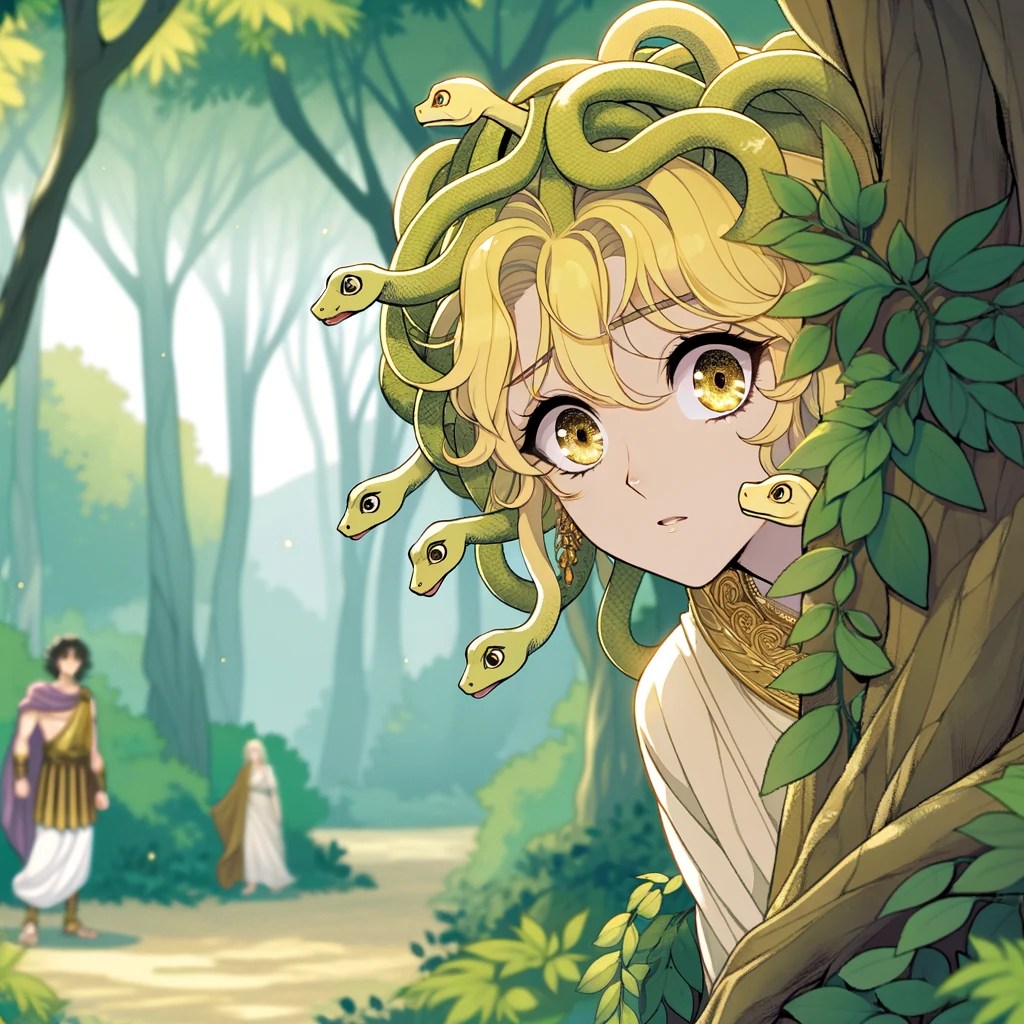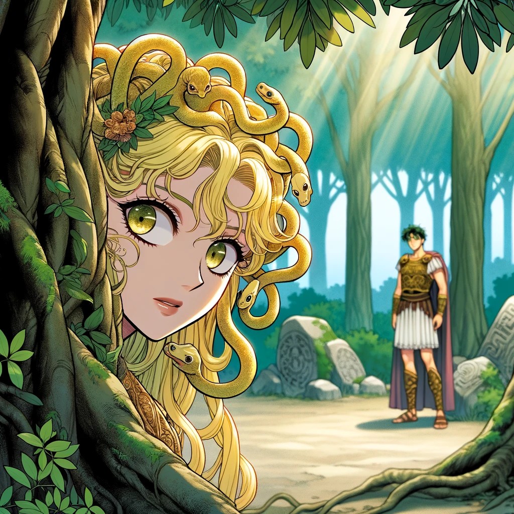 “In an anime style, illustrate Medusa secretly following Perseus through an ancient Greek forest. Medusa, inspired by the appearance of actress Anita Page, has a color scheme of golds and blondes, with all her snake hair being blonde. She’s peeking out from behind a tree, with a subtle, intrigued expression on her face, indicating her attraction. The setting is lush and detailed, embodying the ancient Greek environment, capturing Medusa’s beauty and her hidden observation of Perseus.”