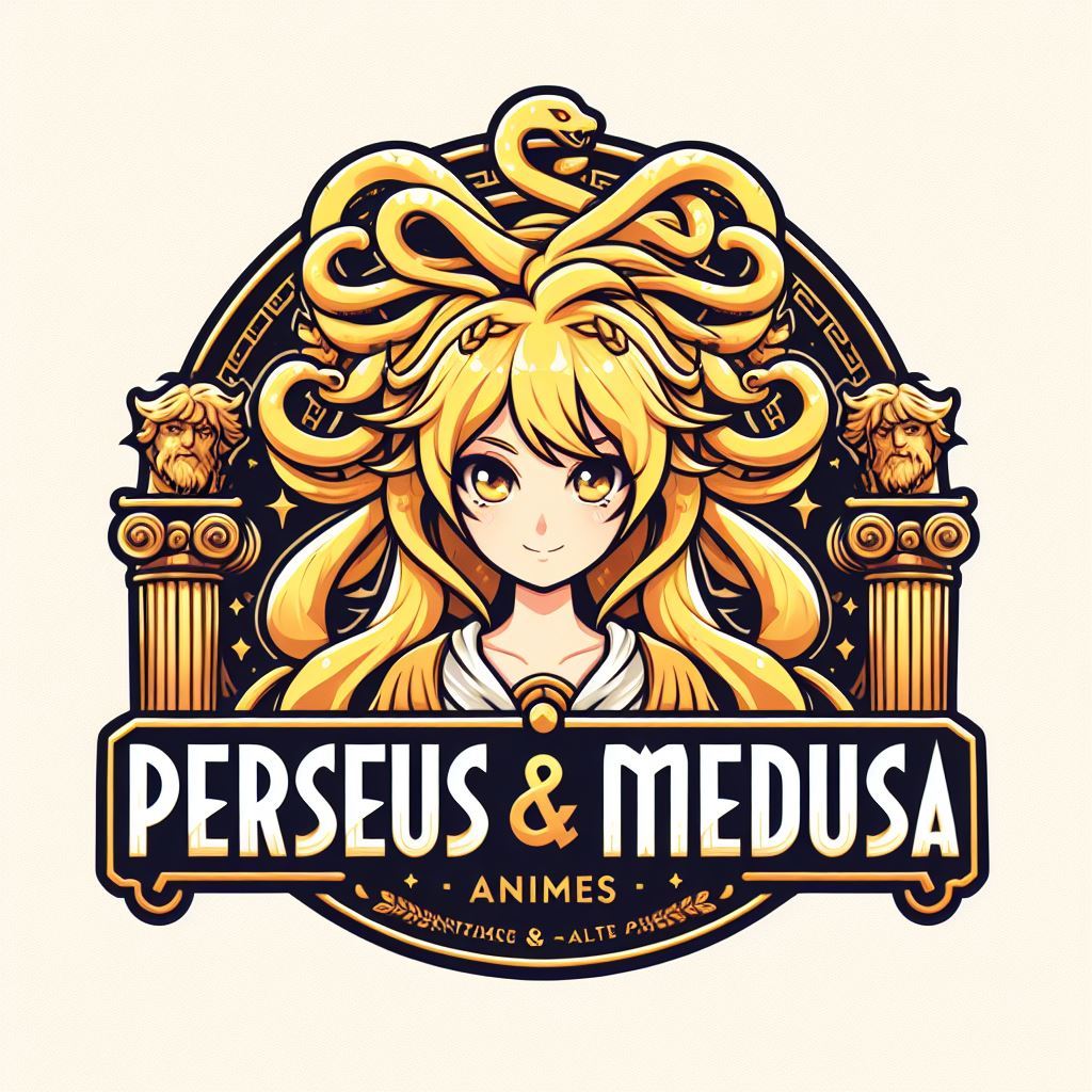Create an anime-style logo for a webpage titled ‘Perseus & Medusa’, ensuring correct spelling. The logo should blend ancient Greek design elements with an anime aesthetic. Use a stylish, readable font, and include anime-influenced decorative elements like stylized Greek columns, laurel wreaths, or mythological motifs. The color scheme should be vibrant and appealing, with a mix of golds, whites, blues, and other colors typical of anime art, evoking a sense of ancient Greek mythology blended with modern anime artistry.