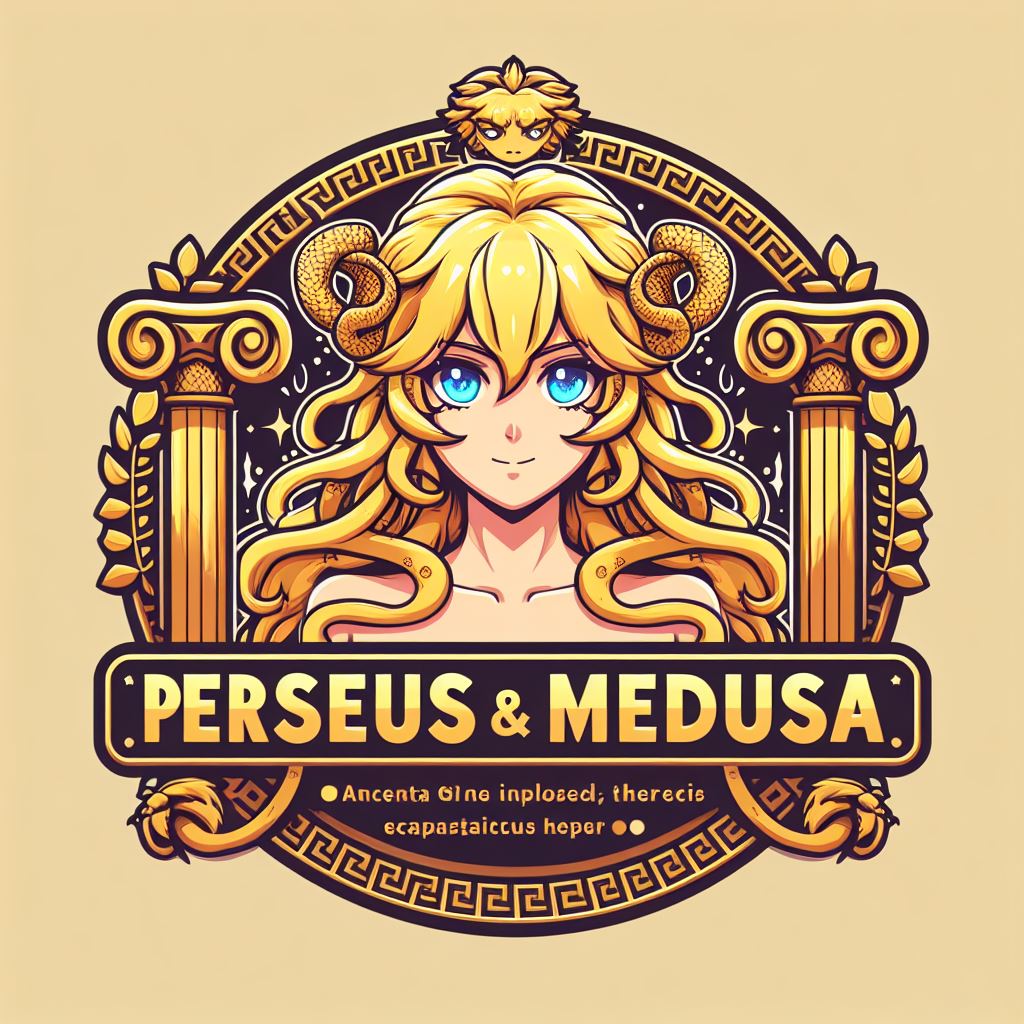 Prompt 2: Create an anime-style logo for a webpage titled ‘Perseus & Medusa’, featuring a depiction of Medusa within the logo. The logo should blend ancient Greek design elements with an anime aesthetic. Medusa should be represented in a style inspired by Anita Page, with gold and blonde color tones. Include stylish, readable font for the title, and anime-influenced Greek motifs like columns or laurel wreaths. The overall design should be vibrant and appealing, combining ancient Greek mythology with modern anime artistry.
