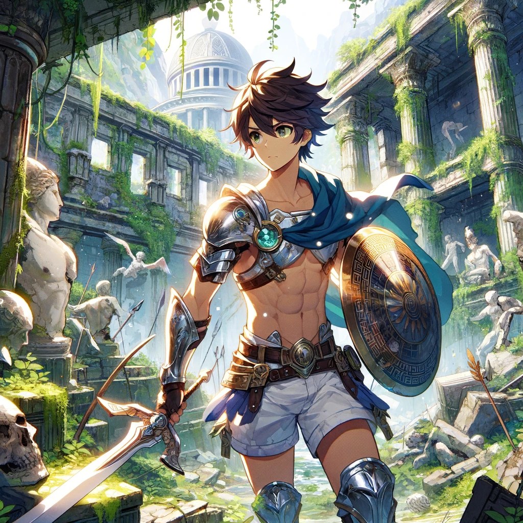 Arrayed in armor gifted by the gods, each piece shimmering like the stars in the night sky, I felt the weight of my divine heritage. The sword of Hermes, a blade that hummed with the promise of swift justice, was secured at my side. Athena’s reflective shield, a marvel that could reveal and distort reality, rested in my grasp. These were not mere weapons; they were symbols of the gods’ favor, bestowed upon me for this fateful quest.