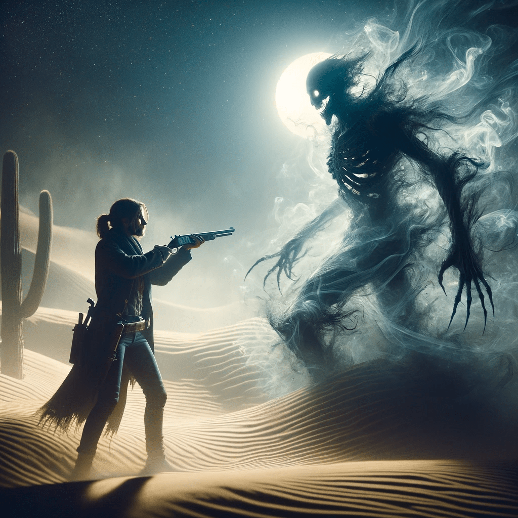 The desert night, a tapestry of deep blues and blacks, enveloped James as she faced the twisted visage of the possessed bandit. His form seemed to flicker and warp, as if he were a flame caught in a relentless wind. The air around him crackled with a sinister energy, the remnants of the ancient curse that had bound his soul to demonic entities.