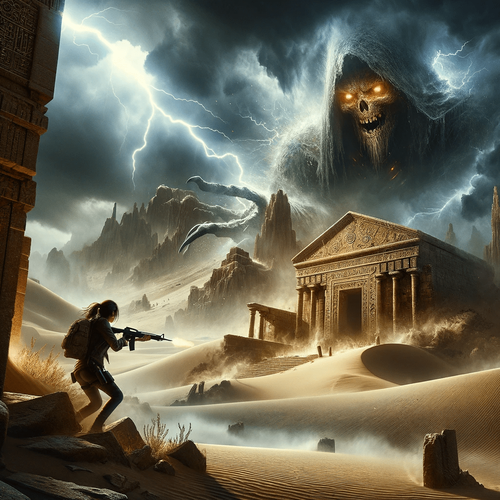 In the distance, a structure loomed, an ancient temple half-buried in the sand. Its walls were etched with symbols that spoke of dark rituals and forbidden powers. It was here that the urn had been kept, a prison for the demonic forces that now plagued the land.
