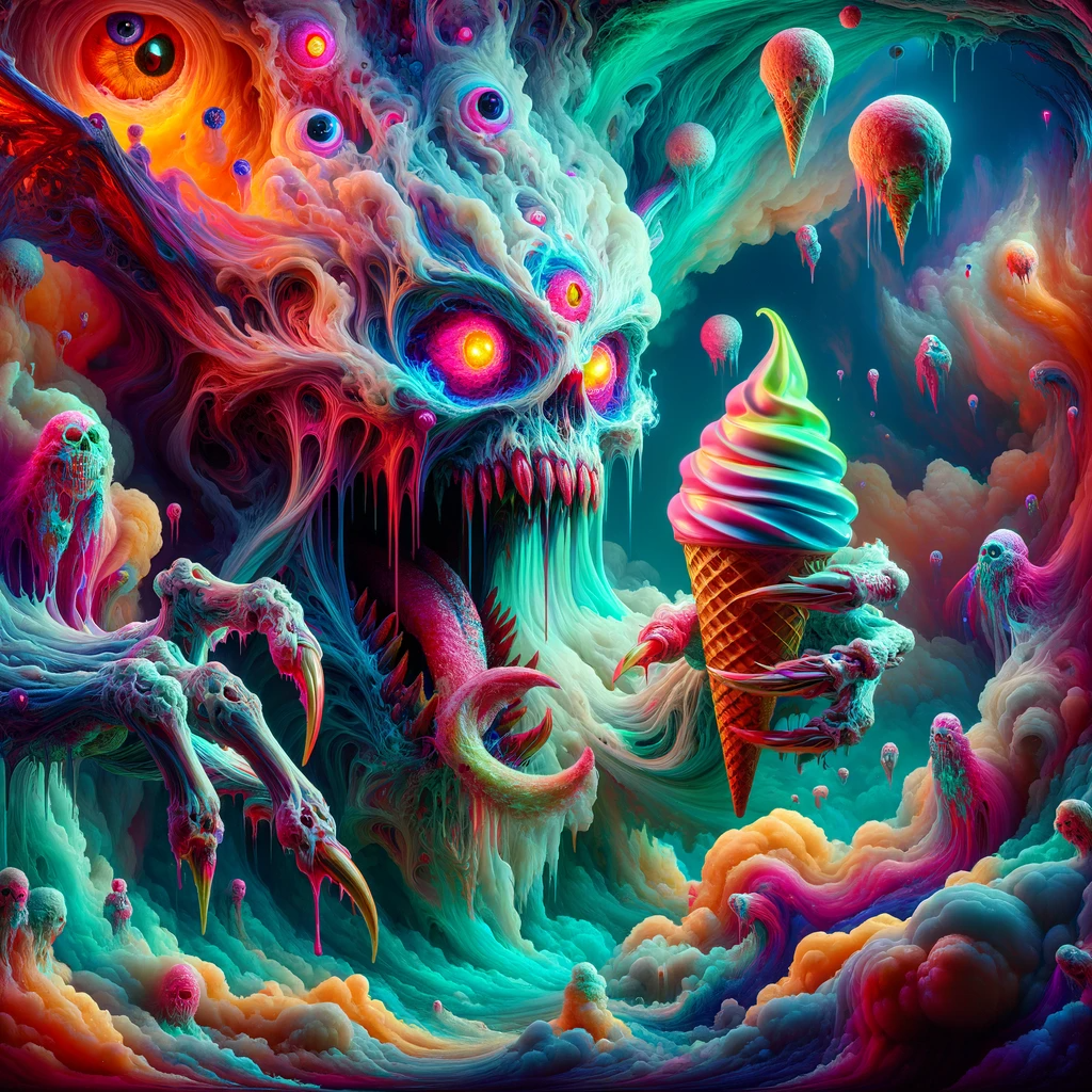 “A hyper-intense, ultra-extreme psychedelic scene featuring demonic entities morphing out of swirling dangerous storm clouds. The clouds are a blend of neon pastels, emanating an eerie glow. Amidst this chaotic atmosphere, surreal ice cream cones float, melting and transforming into bizarre, otherworldly shapes. The demonic entities are a fusion of horror-core and psychedelic art, with exaggerated, nightmarish features, glowing eyes, and elongated, twisted limbs. The entire scene is infused with a sense of depth and movement, enhanced by 4D hyper-surrealistic effects, creating an illusion of a dynamic, immersive environment. The color palette is rich with glowing neon pastels, and the composition is filled with flowing organic shapes and eerie musical elements, all amplified twenty-fold for a visually stunning experience.”
