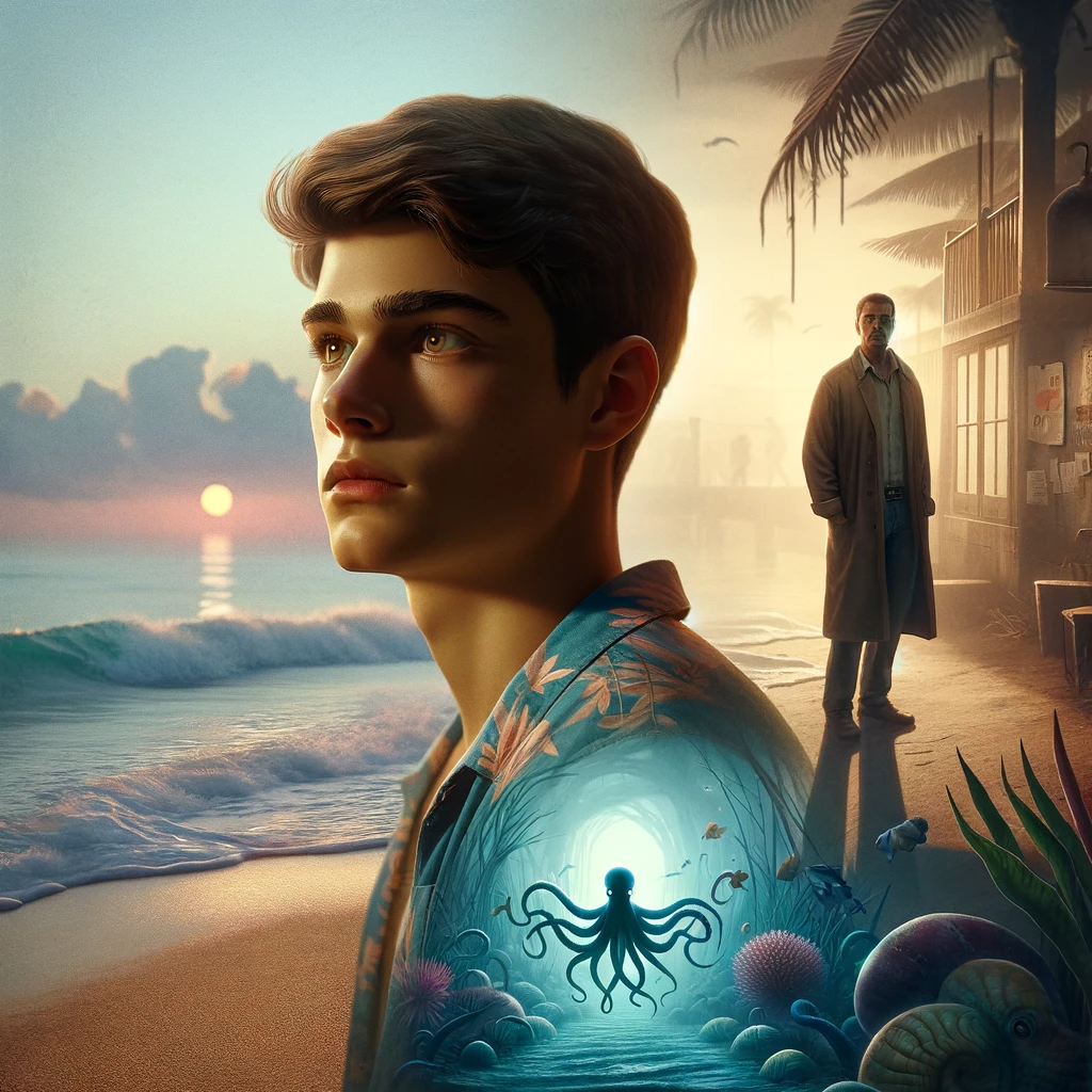 In the lush paradise of Emerald Falls, an idyllic morning dawned, betraying no hint of the horrors lurking beneath. On the sun-kissed beaches, a teenage boy, Alex, gazed out at the tranquil sea, his thoughts adrift in the strained silence between him and his father, David. Meanwhile, in the island’s shadowy underbelly, Leo, a small-time gangster, plotted his next move, oblivious to the impending doom. Unseen, a frilled giant octopus, its tentacles swaying ominously, heralded a nightmare from the depths. The serene waters, a mirror to a sky soon to be stormed, veiled an unspeakable terror about to awaken.