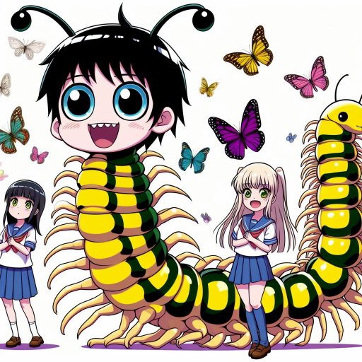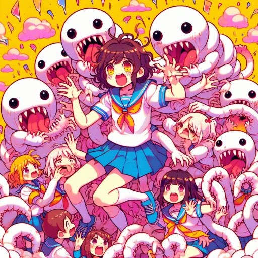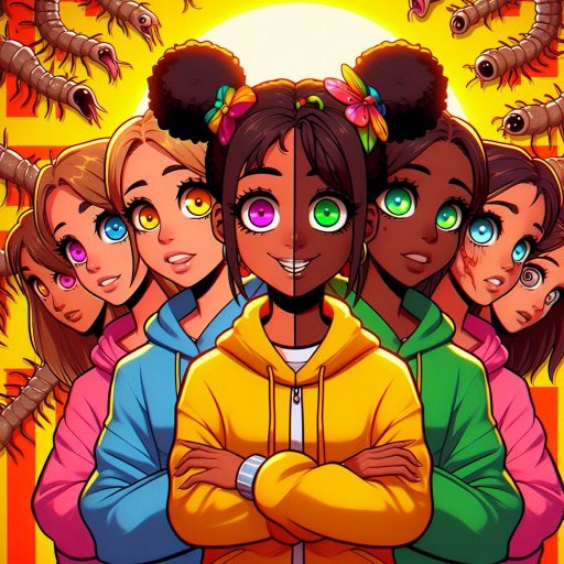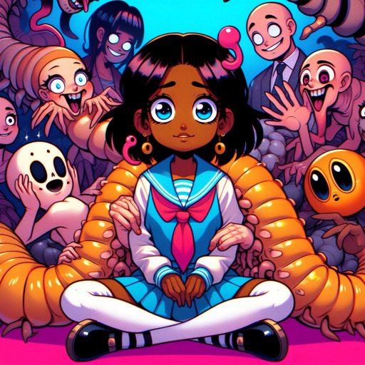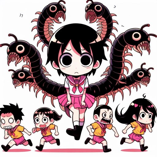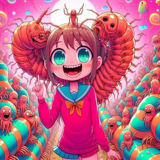 Bing prompt : shojo anime bright and vibrant surreal silly cartoon world harmless kid-safe human centipede horror