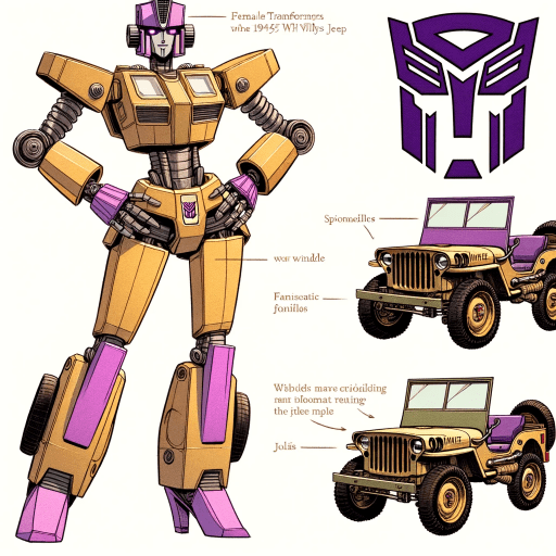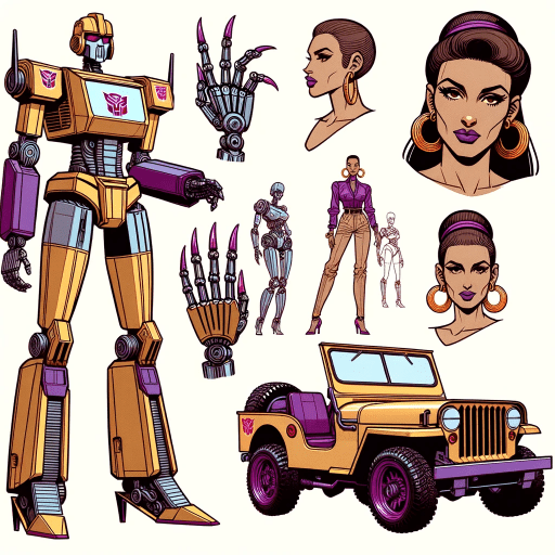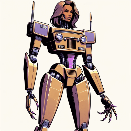 Bing prompt: female Transformer character, inspired by the robot Swindle from the 1984 Transformers cartoon. The design should incorporate Swindle’s specific color scheme, with a tan body and a purple hood, reflecting the 1945 Willys Jeep. The character should have a feminine appearance with a slim, robotic figure and long, articulated fingers that resemble elegant nails. Include features such as a confident stance and fashionable elements suggestive of a famous female rapper’s style