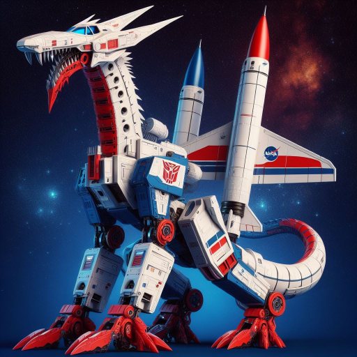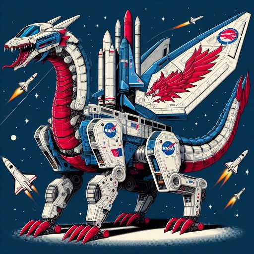 Bing Prompt: Design a robotic creature inspired by the G1 Sky Lynx from Transformers, with a white and blue spacecraft body resembling a NASA shuttle, and an elongated red neck leading to a dragon-like head with sharp teeth. The lower body should be a quadripedal launch platform with red and blue legs, stylized to look like lynx legs. This homage to the character should capture the majestic and powerful stance of Sky Lynx, set against a space-themed backdrop