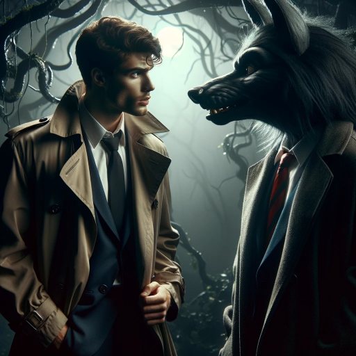 Conversation with the Big Bad Wolf: “A Noircore style image showing a young, handsome detective in a trench coat conversing with the Big Bad Wolf in a mystical forest. The setting is dark and moody, with twisted trees and faint moonlight casting long shadows. The Big Bad Wolf looks distressed and hungry, while the detective appears inquisitive and focused. In the background, the Peppermint Patrol, a group of whimsically armored soldiers, approaches stealthily, adding tension to the scene.”