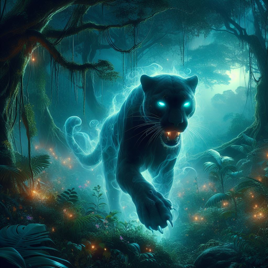 “A hauntingly beautiful jungle core scene at night, where a ghostly, demonic panther prowls. The panther is ethereal, with parts of its body dissolving into mist and shadows, embodying elements of horror core. Its eyes glow with a fierce, otherworldly intensity. The jungle around it is dense and alive, illuminated by a surreal, eerie light that seems to emanate from the vegetation itself. Plants and trees are oversized and have a supernatural appearance, some with faces and symbols forming within their leaves and bark. Double exposure techniques create a sense of movement and ghostly apparitions in the background. The ChatGPT interface is integrated into the scene with subtle, animatronic-style details and a textured, aged look, enhancing the mystical and symbolic nature of the artwork.”