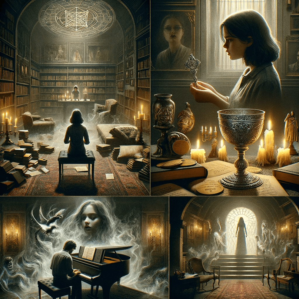 In the music room, as Lena reached for a silver chalice, the piano keys began to play on their own, a haunting melody that echoed the mansion’s sorrow. Ray, his hand on his gun, scanned the room for any threat.