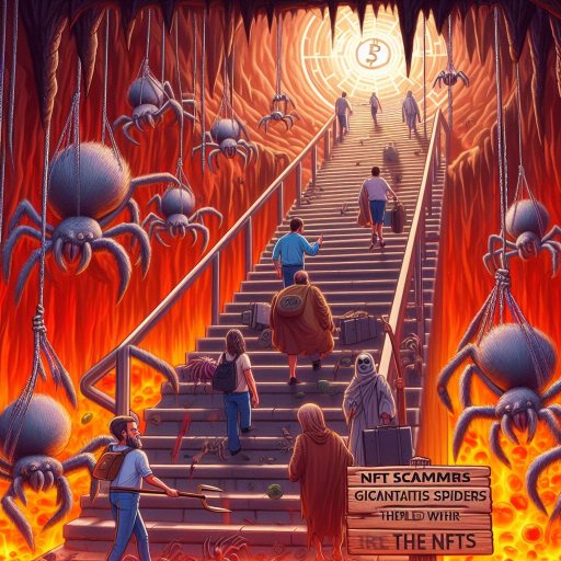 Bing prompt: nft scammers descending into the seventh layer of hell where gigantic spiders and spider webs themed after crypto symbols