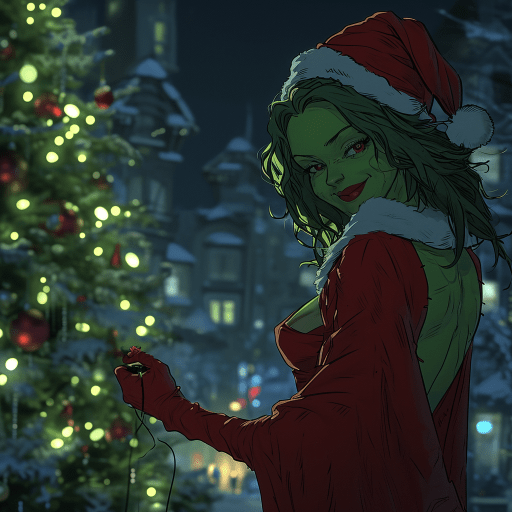 Midjourney Prompt: female Grinch inspired by Michelle Pfeiffer in Gotham City stealing the Christmas tree 1985 anime –v 6.0 –style raw
