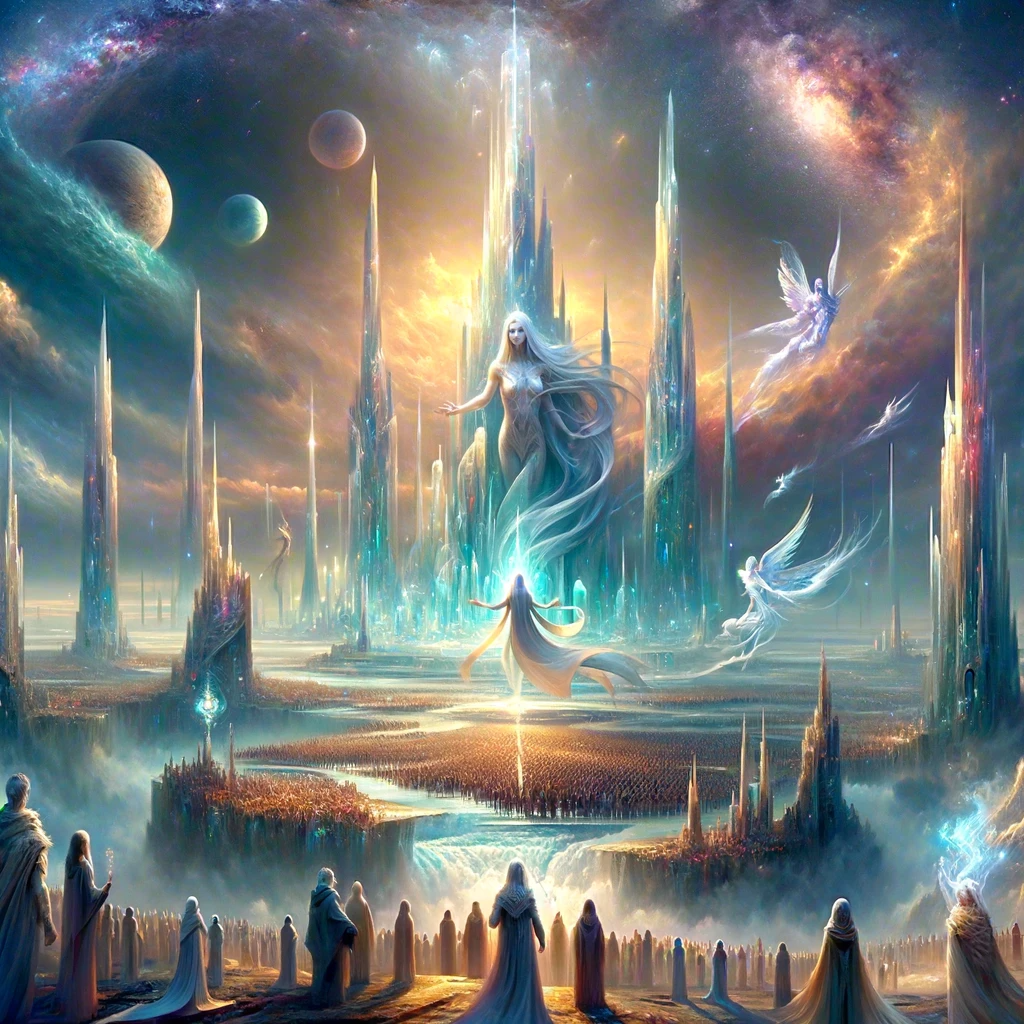 As his form faded, the realm of Etheria transformed. The obsidian spires gave way to crystalline towers, the twilight skies blossomed with auroras, and from the ashes of old, a new Etheria arose—a realm of balance between light and darkness, a testament to their unity.