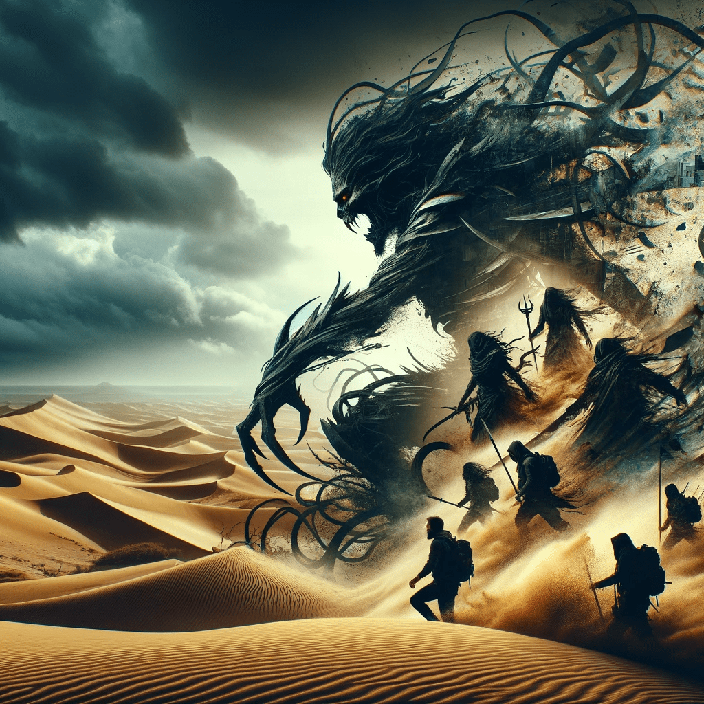 Leading the team to a nearby dune, they discovered a buried structure, its architecture similar to the ruins. Inside, they found an ancient tapestry depicting a battle between spectral warriors and a figure radiating light, holding an amulet and a shadowy veil.