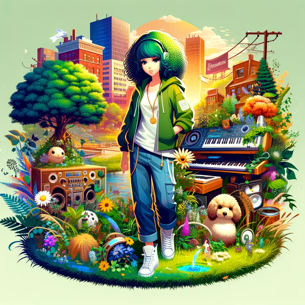 ChatGPT Prompt: An image representing Swede Dish, a female virtual rapper from the band The Incomplete Orchestra. She is depicted in a vibrant, nature-inspired setting, reflecting her connection with the outdoors. Swede Dish is shown with a modern, stylish appearance, symbolizing her focus on the joys of modern life. She stands confidently, surrounded by elements like lush greenery, flowers, and possibly small wildlife, to emphasize her love for nature. The background is a mix of urban and natural elements, blending cityscapes with forests or meadows, showcasing her unique blend of modern life and nature. The overall vibe is upbeat, colorful, and lively, fitting her fun and nature-loving personality