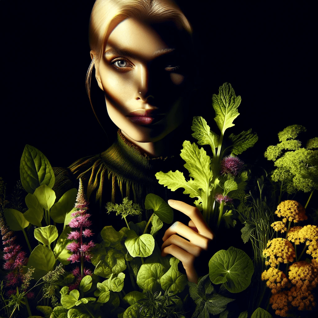 Prompt: An image of a blonde woman in a vibrant, nature-inspired setting, reflecting a connection with the outdoors. She has a modern, stylish appearance, symbolizing the joys of modern life. She stands confidently, surrounded by elements like lush greenery, flowers, and small wildlife. The background is a mix of urban and natural elements, blending cityscapes with forests or meadows. This upbeat, colorful, and lively scene represents Swede Dish, a virtual female rapper, emphasizing her fun and nature-loving personality.