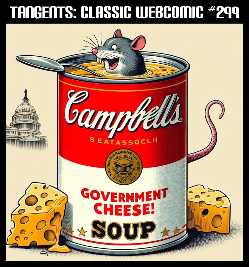 Bing prompt: a Campbell’s soup can with a cartoon Washington DC rat on it with the words “Government Cheese!”