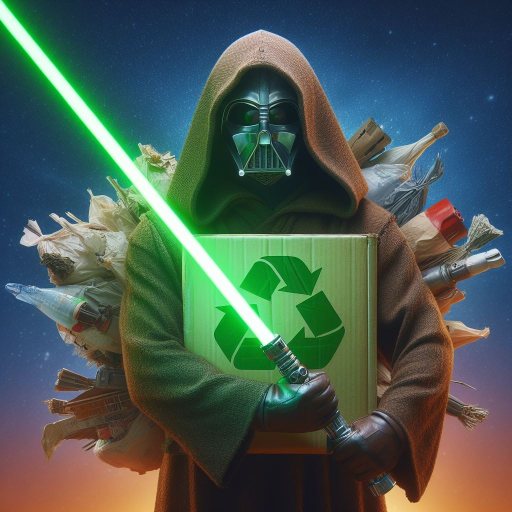 Bing prompt: an eco-friendly lightsaber made out of recyclable materials wielded by a sith of recycling