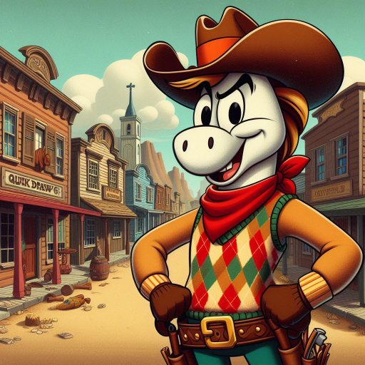Bing prompt: Hanna Barbera horse cartoon character Quickdraw McGraw wearing an argyle sweater and an old western town inspired by argyle