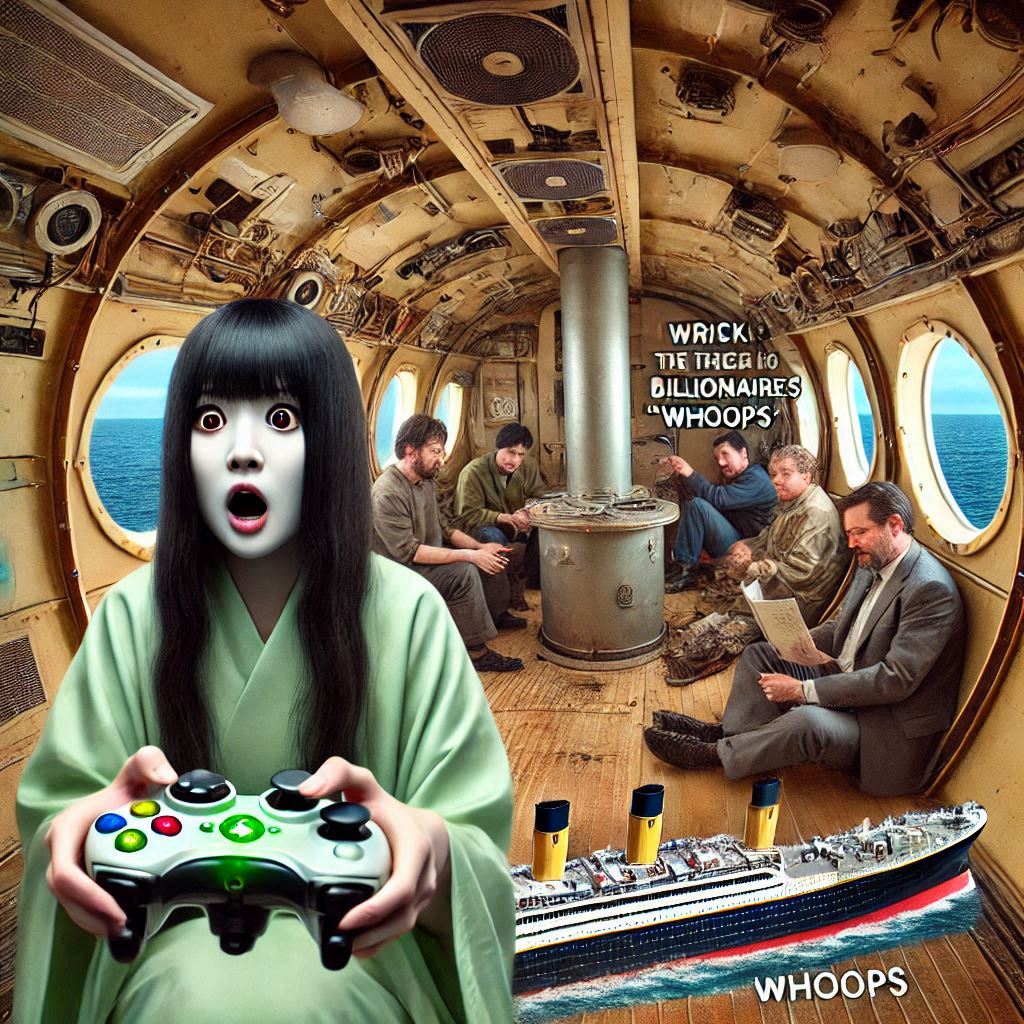 prompt: Ringu. horror. Japanese ghost woman Sadako going to work at her first day as pilot for an tiny Oceangate submarine with a tiny cramped cabin with five guys inside. she is visiting the titanic with billionaires. view inside the submarine as she uses an x-box controller to wreck the sub “whoops”