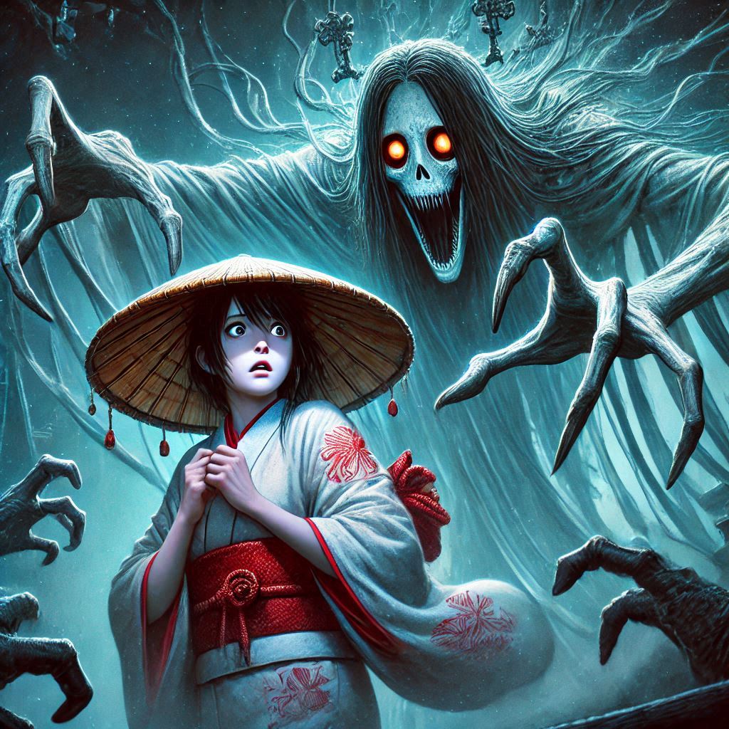 prompt: Ringu. Japanese ghost woman Sadako genuinely scared of the creatures on Elden Ring who totally outclass her. Elden Ring is a fantasy world full of gigantic and frightening Eldritch style monsters. Sadako is no match.