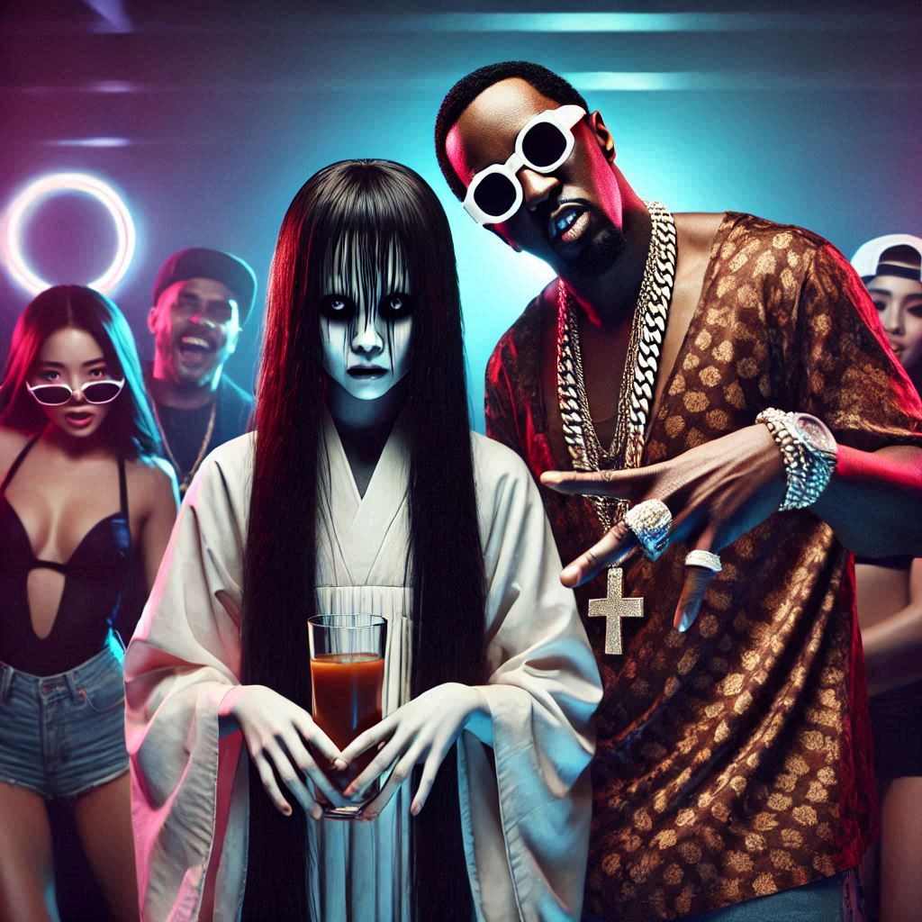 prompt: Ringu. Japanese ghost woman Sadako at a party with hip hop entertainer Diddy